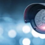 Close up of CCTV camera over defocused background with copy space